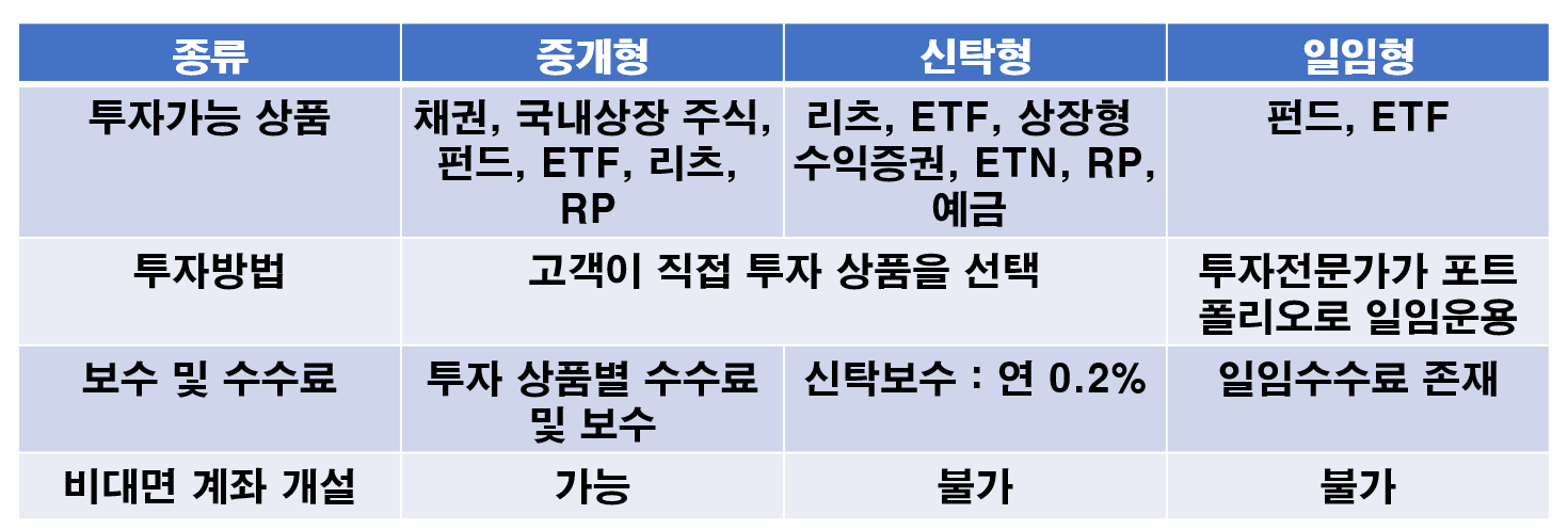 - 중개형 : 2021년에 출시되었으며, 기존 펀드, 파생결합증권, 리츠 외에도 국내 상장 주식의 직접 투자가 가능하다는 점이 특집이다. 다만 예금과 적금은 불가능하다.